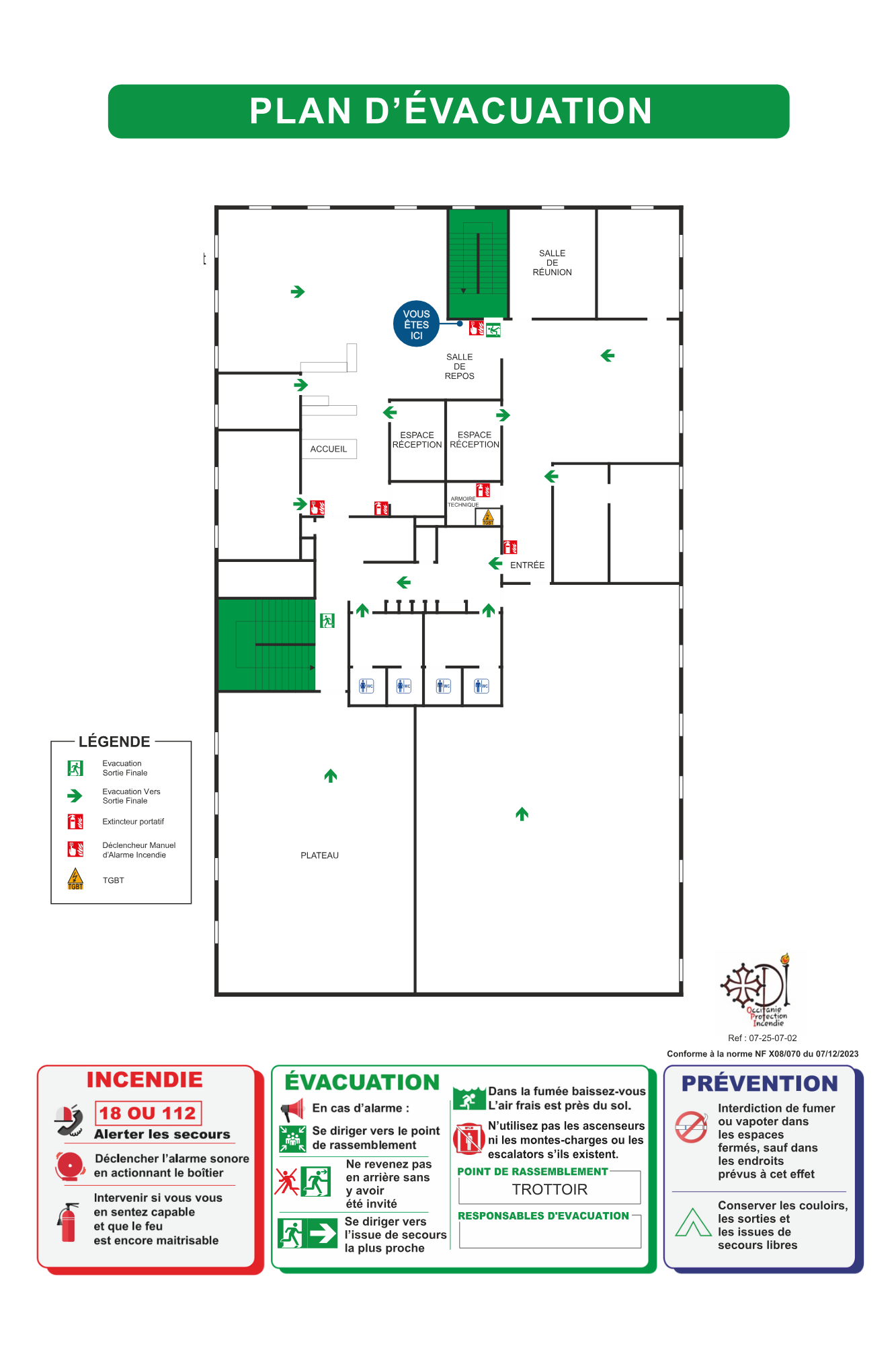 Occitanie Protection Incendie réalise vos plans d’évacuation en Occitanie : relevé sur site, conception, impression et pose.